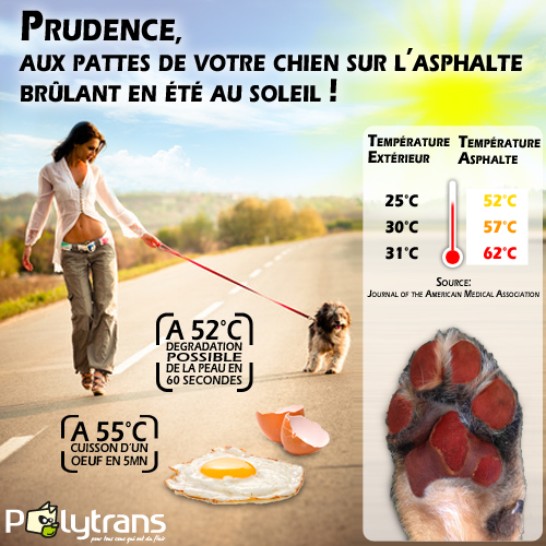 Au vu des fortes températures annoncées, je voulais faire le point sur les soins des coussinets. L’asphalte montre TRÈS vite en température (cfr image en bas de page) et peut présenter un risque pour nos compagnons de balade.