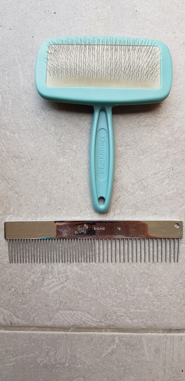 – le peigne : l’écart des dents est divisé en 2 parties : un côté à 5 mm pour les noeuds et la bourre qui tombe et un autre à 2 mm pour finir et lisser